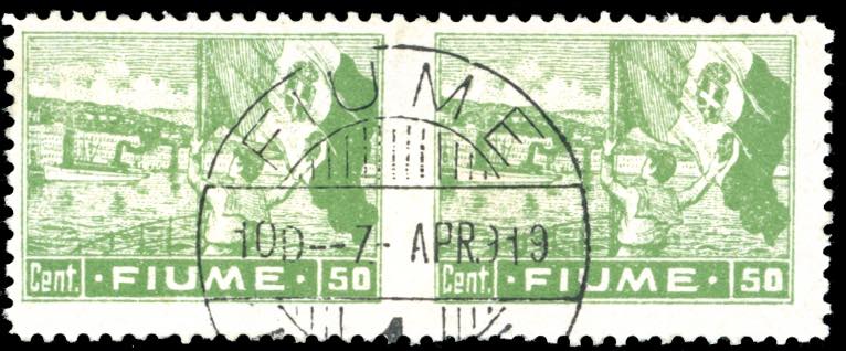 FIUME 1919 - 50 cent. Allegorie e Vedute, carta C, coppia orizzontale non dentellata al centro (C42h), usata, perfetta. Ferrario.