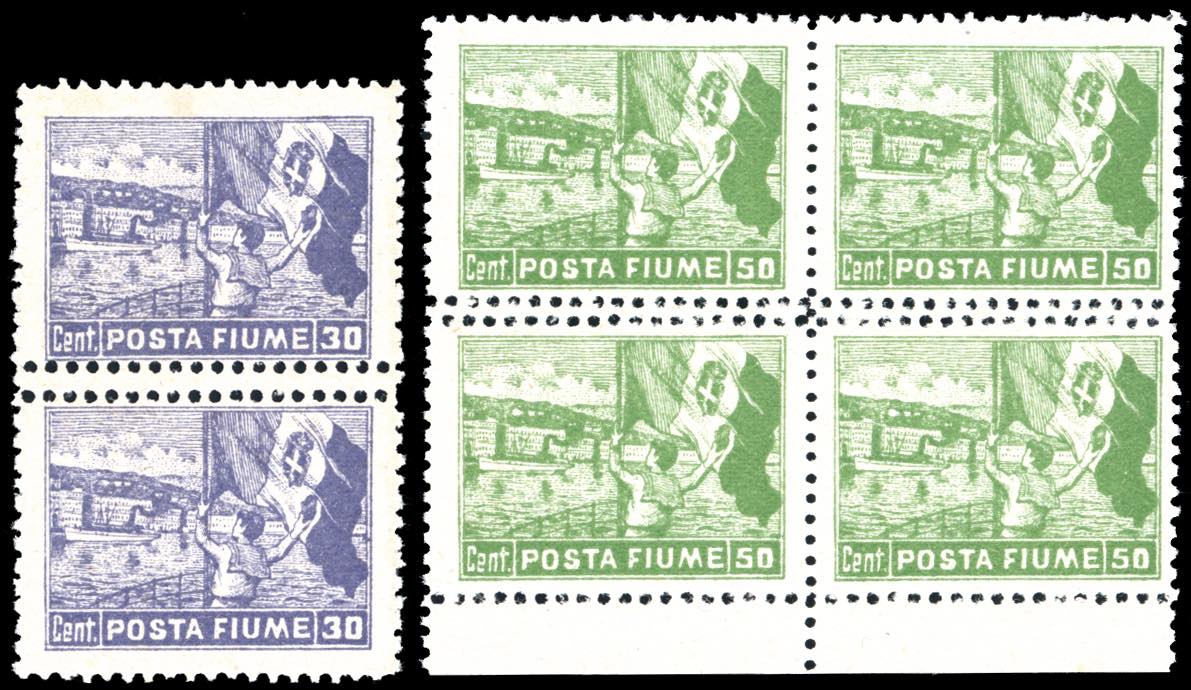 FIUME 1919 - 30 cent., coppia verticale, e 50 cent., blocco di quattro, Posta Fiume, tutti con doppia dentellatura orizzontale al centro ... Leggi tutto