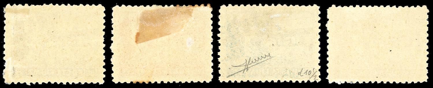 FIUME 1918 - 1 cor., 2 cor., 3 cor. e 5 cor. Posta Fiume, non emessi, dent. 10 1/2 serie completa (58/I-61/I), gomma originale, ottimo stato (il 3 cor. presenta un piccolo assotigliamento e alcuni punti di ossidazione). Raro insieme. Cert. Sorani per il 2 corone.
