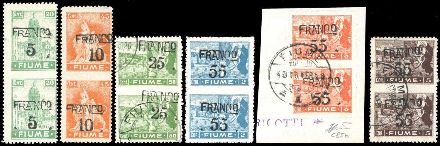 FIUME 1919 - 5 cent. su 20 cent., 10 cent. su 45 cent., 25 cent. su 50 cent., 55 cent. su 2 cor., 55 cent. su 3 cor., 55 cent. su 5 cor., ... Leggi tutto
