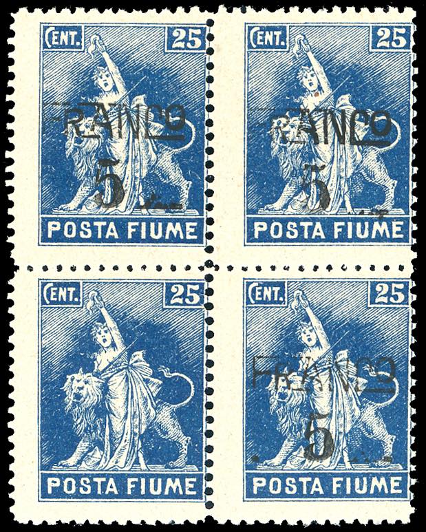 FIUME 1919/20 - 5 cent. su 25 cent. Posta Fiume, soprastampato "FRANCO" (D76), blocco di quattro, un esemplare senza soprastampa, gomma originale, integra per i due esemplari inferiori, perfetto. Varietà d'effetto e molto rara, non catalogata. Insieme probabilmente unico.
