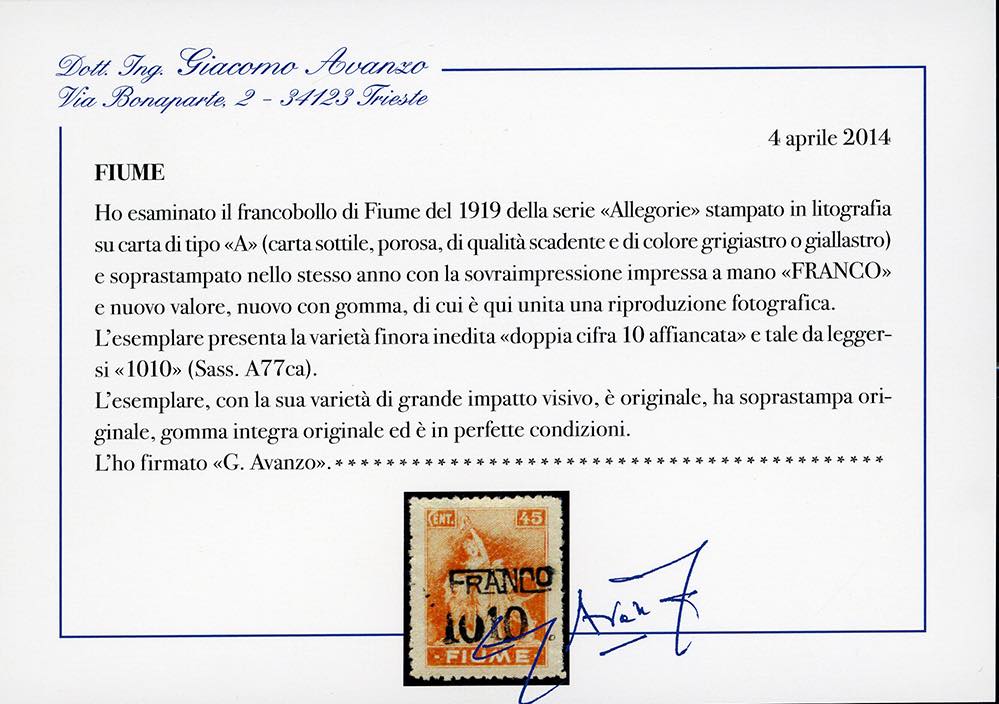 FIUME 1919/20 - 10 cent. su 45 cent. soprastampato "FRANCO", carta A, doppia soprastampa "!0" (A77ac), gomma originale integra, perfetto. UNICO ESEMPLARE NOTO di questa varietà di grande impatto visivo. Cert. Avanzo.
