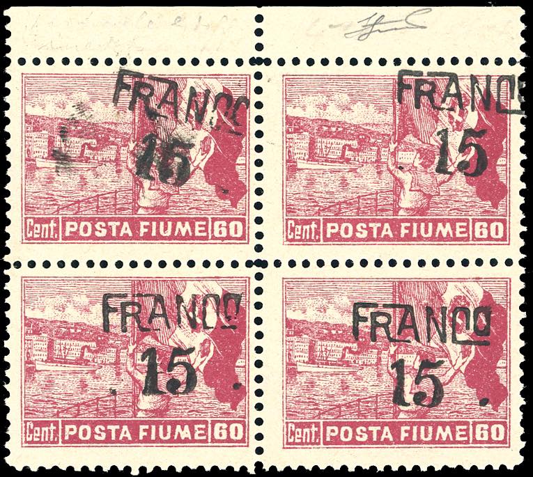 FIUME 1919 - 15 cent. su 60 cent. Posta Fiume, blocco di quattro, un esemplare con soprastampa obliqua, uno con soprastampa "Franc" senza la "o" fortemente spostata in alto (D80hc,D80ro), bordo di foglio, nuovo, gomma originale integra, perfetto. G.Oliva, Ferrario.