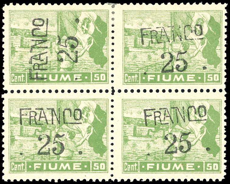 FIUME 1919/20 - 25 cent. su 50 cent. soprastampato "FRANCO", carta C, blocco di quattro, un esemplare con soprastampa verticale, due con ... Leggi tutto
