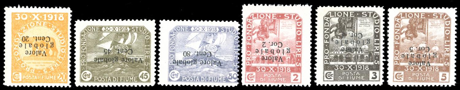 FIUME 1919 - Soprastampati "Valore globale", serie completa dei sei valori noti con soprastampa capovolta (91b,92b,94b,96b,97b,98b), nuovi, ... Leggi tutto