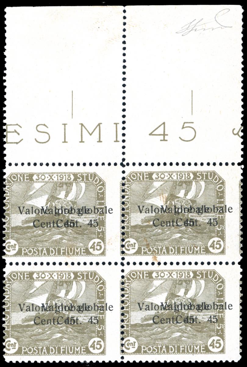 FIUME 1919 - 45 cent. su 45 cent. soprastampato "Valore globale", doppia soprastampa di cui una fortemente spostata a destra (92cb), blocco ... Leggi tutto