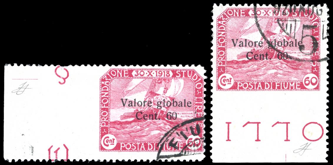 FIUME 1919 - 60 cent. su 60 cent. soprastampato "Valore globale", un esemplare non dentellato in basso e uno non dentellato a sinistra ... Leggi tutto