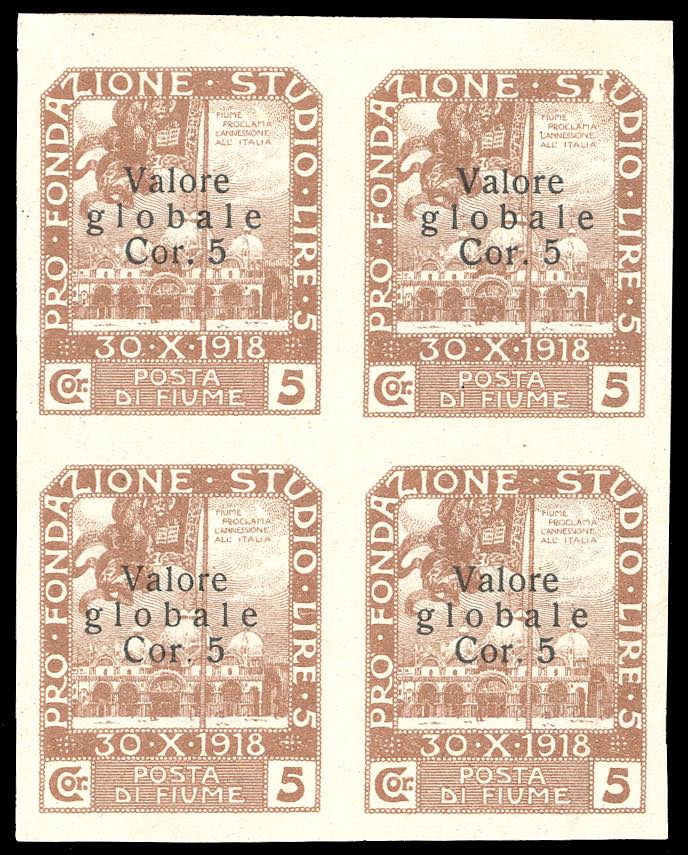 FIUME 1919 - 5 cor. su 5 cor. soprastampato "Valore globale", non dentellato (98k), blocco di quattro, gomma originale, integra per tre esemplari, perfetto. G.Oliva.