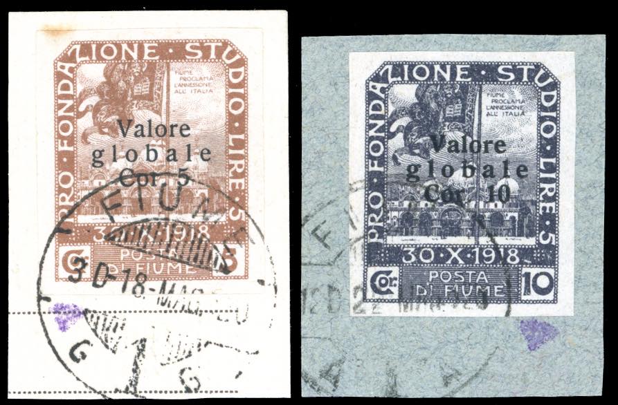 FIUME 1920 - 5 cor. su 5 cor. e 10 cor. su 10 cor. Valore globale, entrambi non dentellati (110l,111l), perfetti, ciascuno usato su frammento.