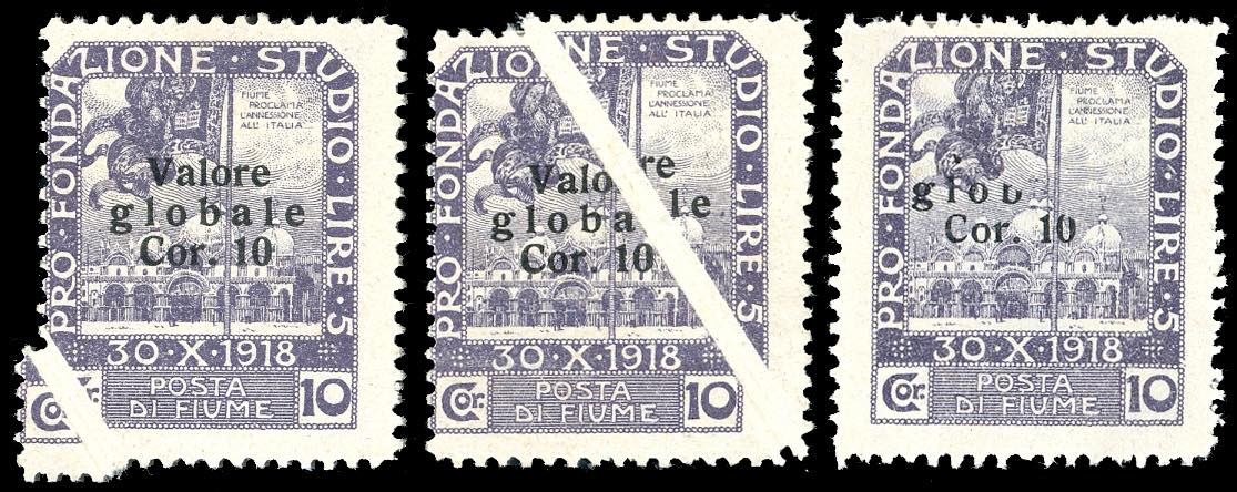 FIUME 1920 -10 cor. su 10 cor. soprastampato "Valore globale" (111), tre esemplari con belle ed evidenti varietà di stampa e/o ... Leggi tutto
