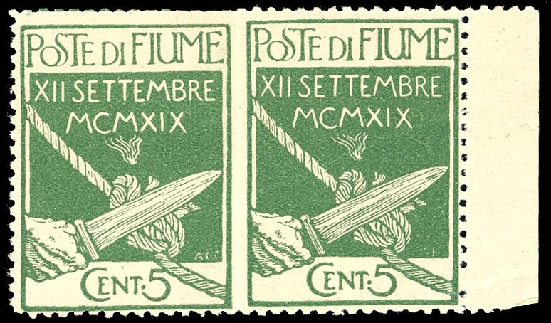 FIUME 1920 - 5 cent. Legionari, coppia orizzontale non dentellata al centro (127g), bordo di foglio, gomma originale integra, buono stato. ... Leggi tutto
