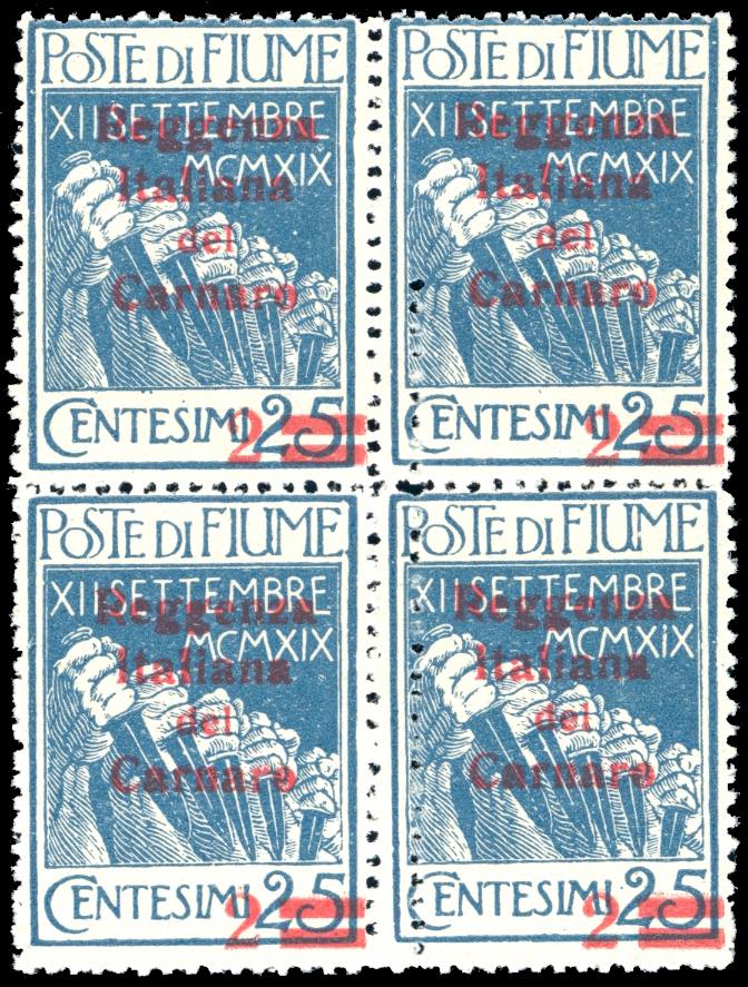 FIUME 1920 - 2 cent. su 25 cent. azzurro, soprastampato "Reggenza Italiana del Carnaro" (132a), blocco di quattro, doppia dentellatura ... Leggi tutto