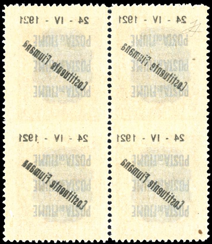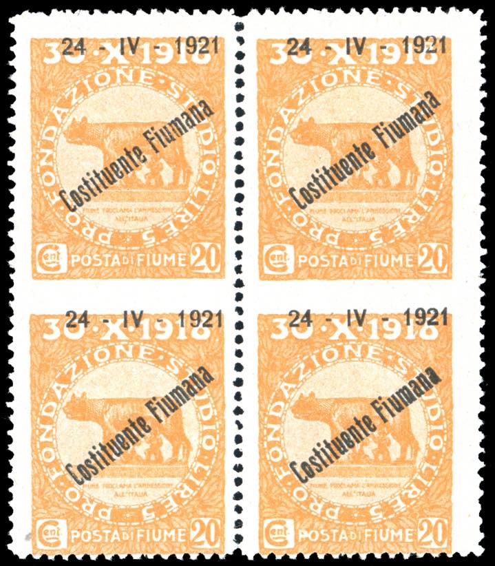 FIUME 1921 - 20 cent. soprastampato "Costituente Fiumana", blocco di quattro comprendente due coppie verticali non dentellate al centro, ... Leggi tutto