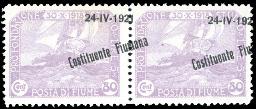 FIUME 1921 - 80 cent. soprastampato "Costituente Fiumana", soprastampa fortemente spostata in senso orizzontale (170k), coppia orizzontale, ... Leggi tutto