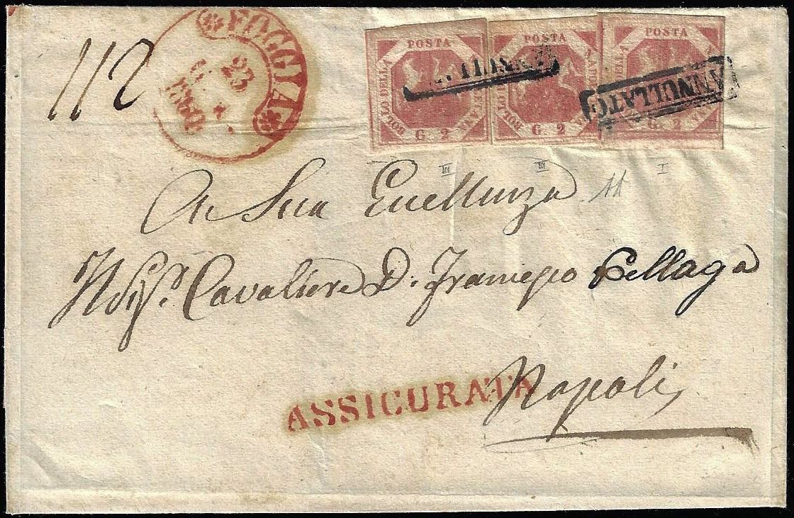 1860 - 2 grana rosa carminio I tavola, 2 grana carminio III tavola, due esemplari (5d,7d), perfetti, su assicurata di un foglio e mezzo da Foggia 23/1/1860 a Napoli. Bella e rara affrancatura con valori gemelli di tavole differenti. A.Diena.