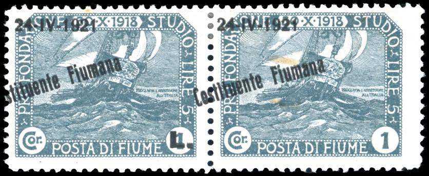 FIUME 1921 - 1 lira soprastampato "Costituente Fiumana", soprastampa fortemente spostata a sinistra, "L." a destra (171l), coppia orizzontale, il secondo esemplare senza "L." in soprastampa, nuova, gomma originale, perfetta combinazione di varietà non catalogata (ultima colonna del foglio della varietà 171l). Ferrario.