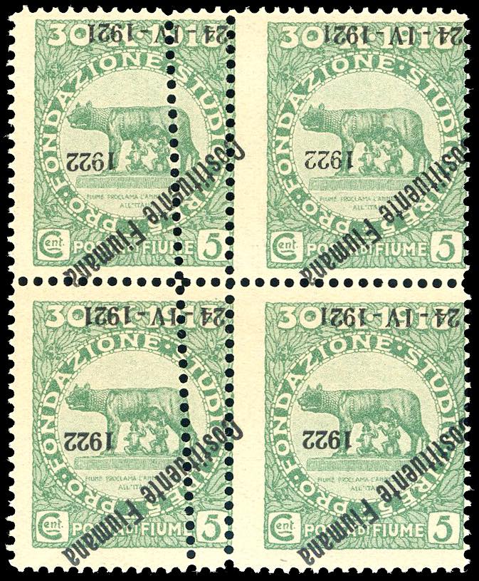 FIUME 1922 - 5 cent. soprastampato "Costituente Fiumana", blocco di quattro, soprastampa capovolta e doppia dentellatura verticale al ... Leggi tutto