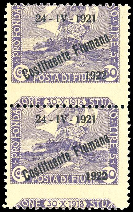 FIUME 1922 - 80 cent. soprastampato "Costituente Fiumana", dentellatura orizzontale fortemente spostata in basso (185vd), coppia verticale, ... Leggi tutto