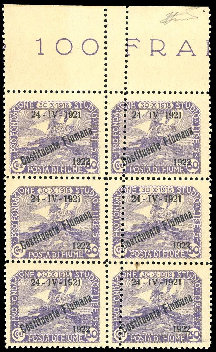 FIUME 1922 - 80 cent. soprastampato "Costituente Fiumana", blocco di sei esemplari comprendente tre coppie orizzontali con doppia dentellatura obliqua al centro (185xb nota), bordo di foglio, nuovo, gomma originale integra, perfetto.