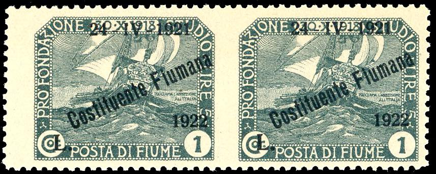 FIUME 1922 - 1 lira soprastampato "Costituente Fiumana", coppia orizzontale non dentellata al centro (186t), nuova, gomma originale integra, perfetta. Ferrario.