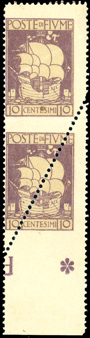 FIUME 1923 - 10 cent. San Vito, coppia verticale non dentellata al centro e in basso e con un'ulteriore dentellatura obliqua che attraversa ... Leggi tutto
