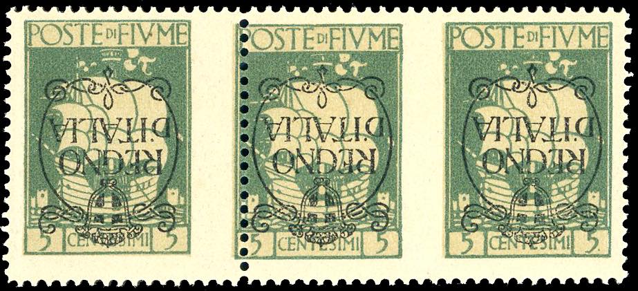 FIUME 1924 - 5 cent. soprastampato "Regno d'Italia", soprastampa capovolta (202e), striscia orizzontale di tre comprendente una coppia non ... Leggi tutto