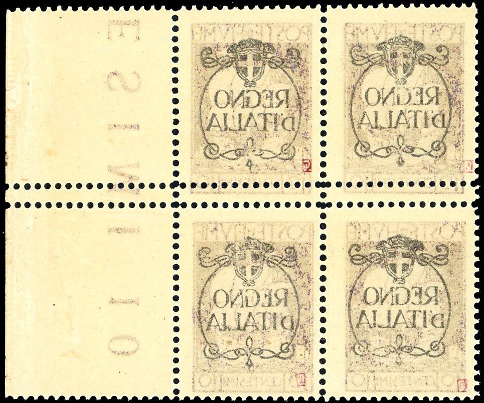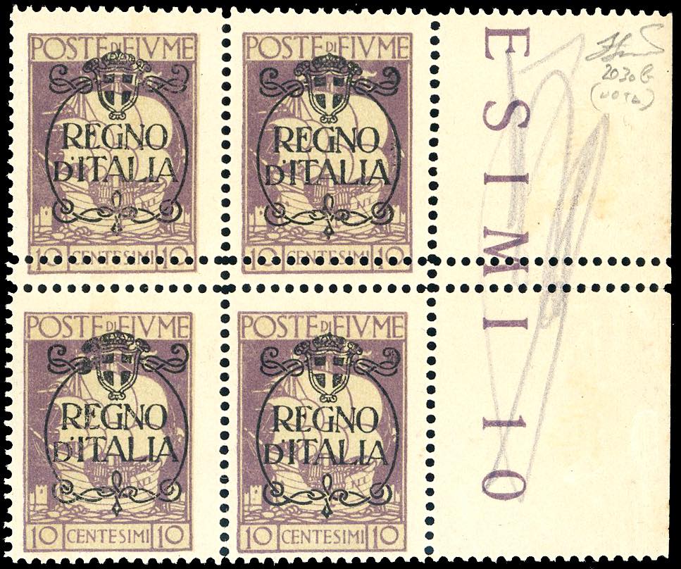 FIUME 1924 - 10 cent. soprastampato "Regno d'Italia", blocco di quattro comprendente due coppie verticali con doppia dentellatura al ... Leggi tutto