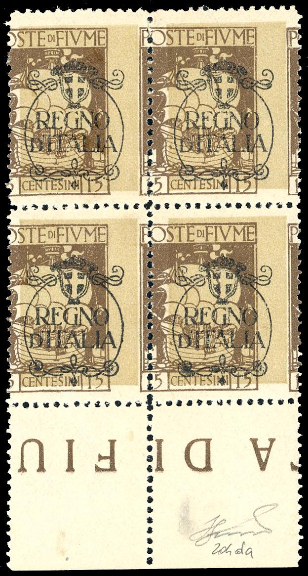 FIUME 1924 - 15 cent. soprastampato "Regno d'Italia", stampa del francobollo fortemente spostata a sinistra (204da), blocco di quattro, bordo di foglio, nuovo, gomma originale integra, perfetto. Ferrario.
