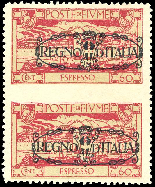 FIUME ESPRESSI 1924 - 60 cent. soprastampato "Regno d'Italia", coppia verticale non dentellata al centro (9ma), nuova, gomma originale, ... Leggi tutto
