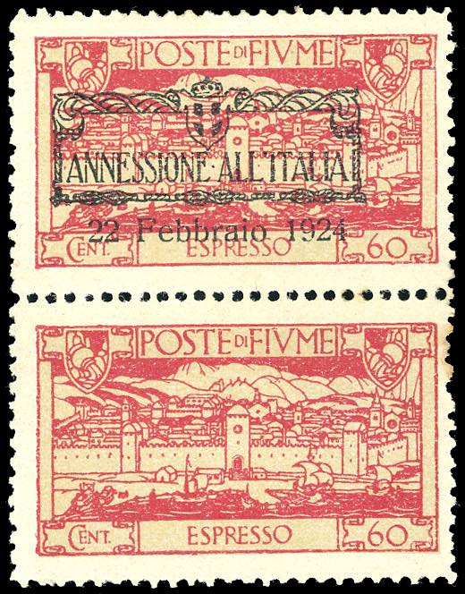 FIUME ESPRESSI 1924 - 60 cent. soprastampato "Annessione all'Italia", coppia verticale, l'esemplare inferiore senza soprastampa (11c), nuova, gomma originale integra, perfetto. G.Oliva, Ferrario.