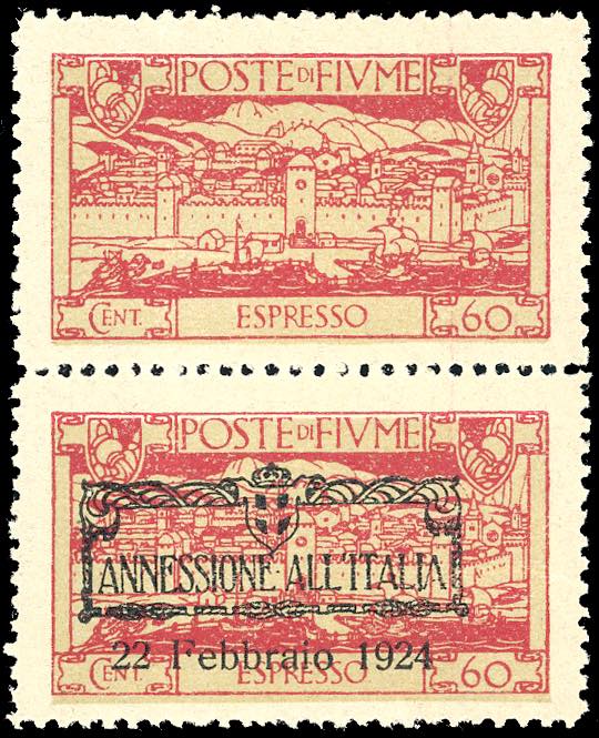 FIUME ESPRESSI 1924 - 60 cent. soprastampato "Annessione all'Italia", coppia verticale, l'esemplare superiore senza soprastampa (11c), ... Leggi tutto