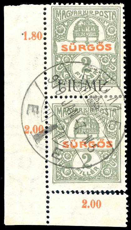 FIUME GIORNALI 1918/19 - 2 f. oliva e rosso, soprastampa a macchina, coppia verticale, un esemplare senza soprastampa (2f), angolo di foglio, usata, perfetta. Molto bella.
