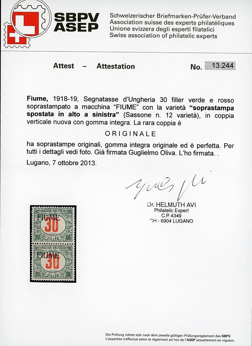 FIUME SEGNATASSE 1918/19 - 30 f. cifre rosse, soprastampa a macchina fortemente spostata a sinistra (12caf), coppia verticale, gomma originale integra, perfetta. Rara. G.Oliva, cert. Avi.
