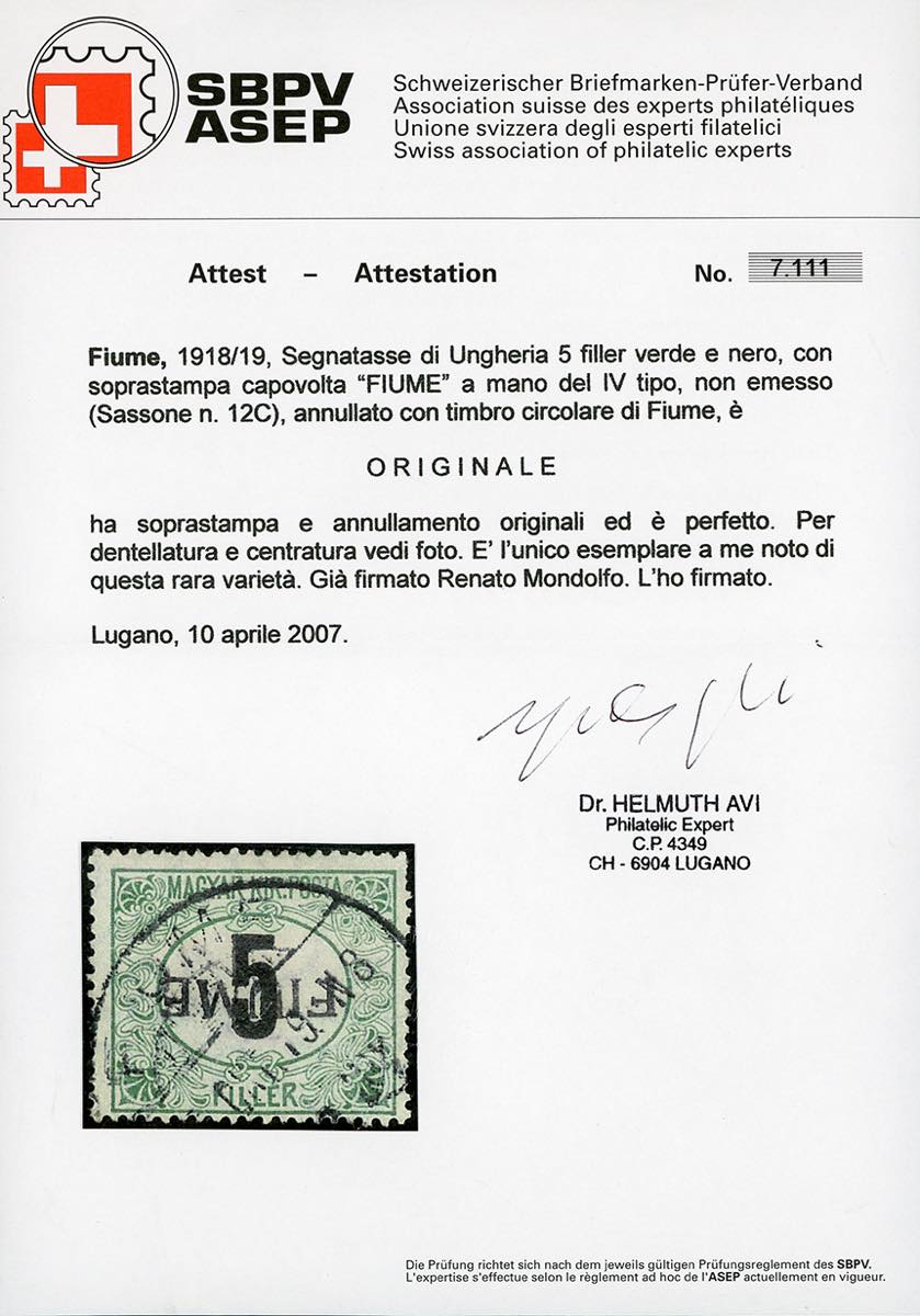 FIUME SEGNATASSE 1918/19 - 5 f. verde e nero, soprastampa a mano del IV tipo capovolta, non emesso, (12C), usato, perfetto. UNICO ESEMPLARE NOTO con questo tipo di soprastampa. Una delle massime rarità della collezione di Fiume. R.Mondolfo, cert. Avi.