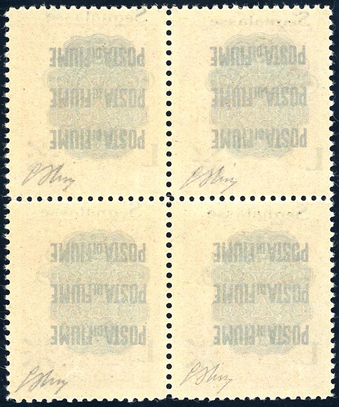 FIUME SEGNATASSE 1921 - 0,04 lire su 10 cent. soprastampato (16), blocco di quattro, gomma originale integra, perfetto e molto fresco. G.Oliva.
