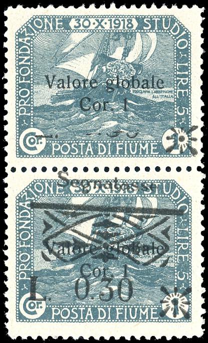 FIUME SEGNATASSE 1921 - 0,30 lire su 1 cor. soprastampato, coppia verticale, un esemplare senza soprastampa, l'altro con soprastampa ... Leggi tutto