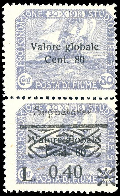 FIUME SEGNATASSE 1921 - 0,40 lire su 80 cent. soprastampato, coppia verticale, un esemplare senza soprastampa (21kaa), nuova, gomma originale, perfetta. Ferrario.