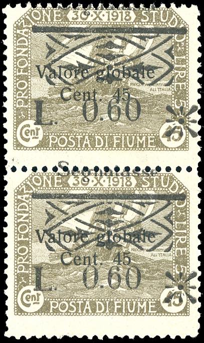 FIUME SEGNATASSE 1921 - 0,60 lire su 45 cent. soprastampato, soprastampa fortemente spostata in alto, "Segnatasse" a cavallo, coppia ... Leggi tutto