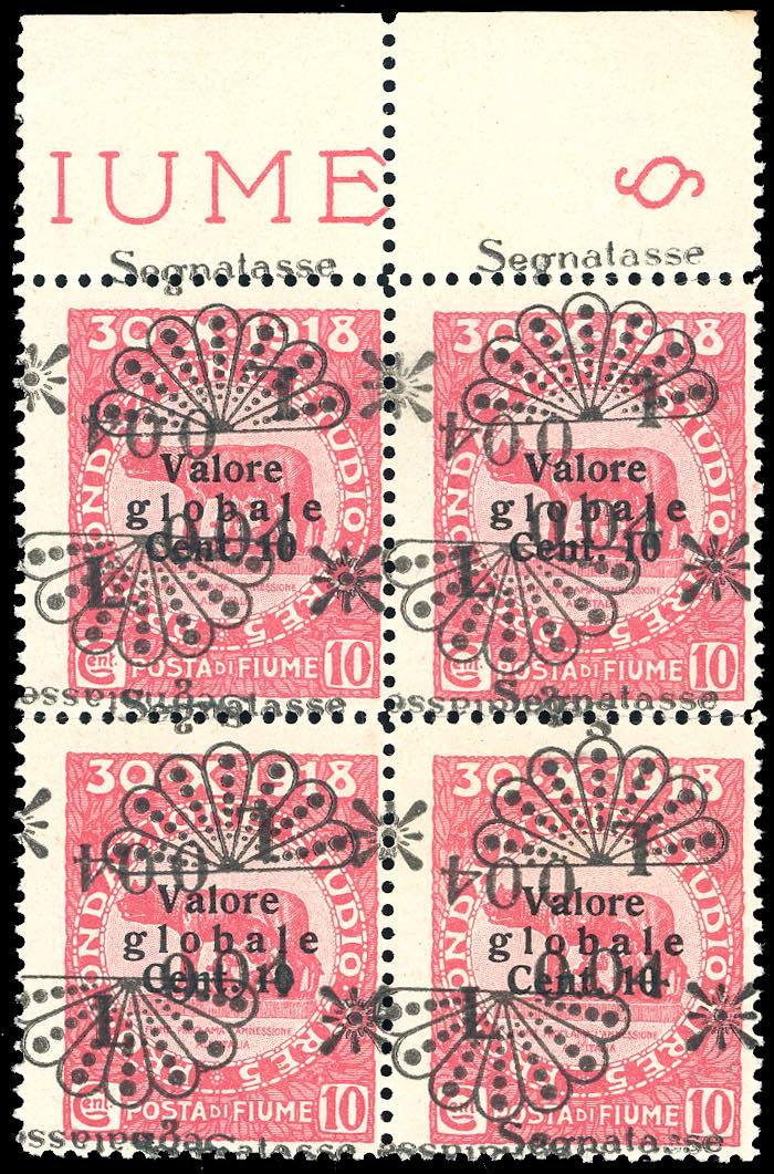 FIUME SEGNATASSE 1921 - 0,04 lire su 10 cent. soprastampatp, doppia soprastampa di cui una capovolta (26k), blocco di quattro, bordo di ... Leggi tutto