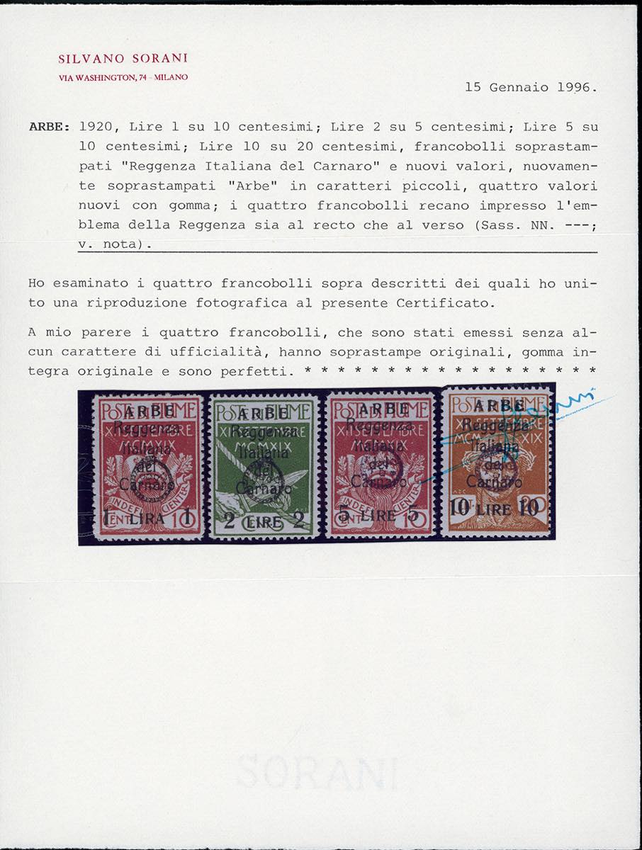 ARBE 1920 - 1 lira su 10 cent, 2 lire su 5 cent., 5 lire su 10 cent., 10 lire su 20 cent. soprastampati "Reggenza Italiana del Carnaro", soprastampati "ARBE" in caratteri piccoli, emblema della Reggenza sia al recto che al verso (Sass.nota), gomma originale integra, perfetti. Molto rari, malgrado siamo stati emessi senza carattere di ufficialità. Cert. Sorani.