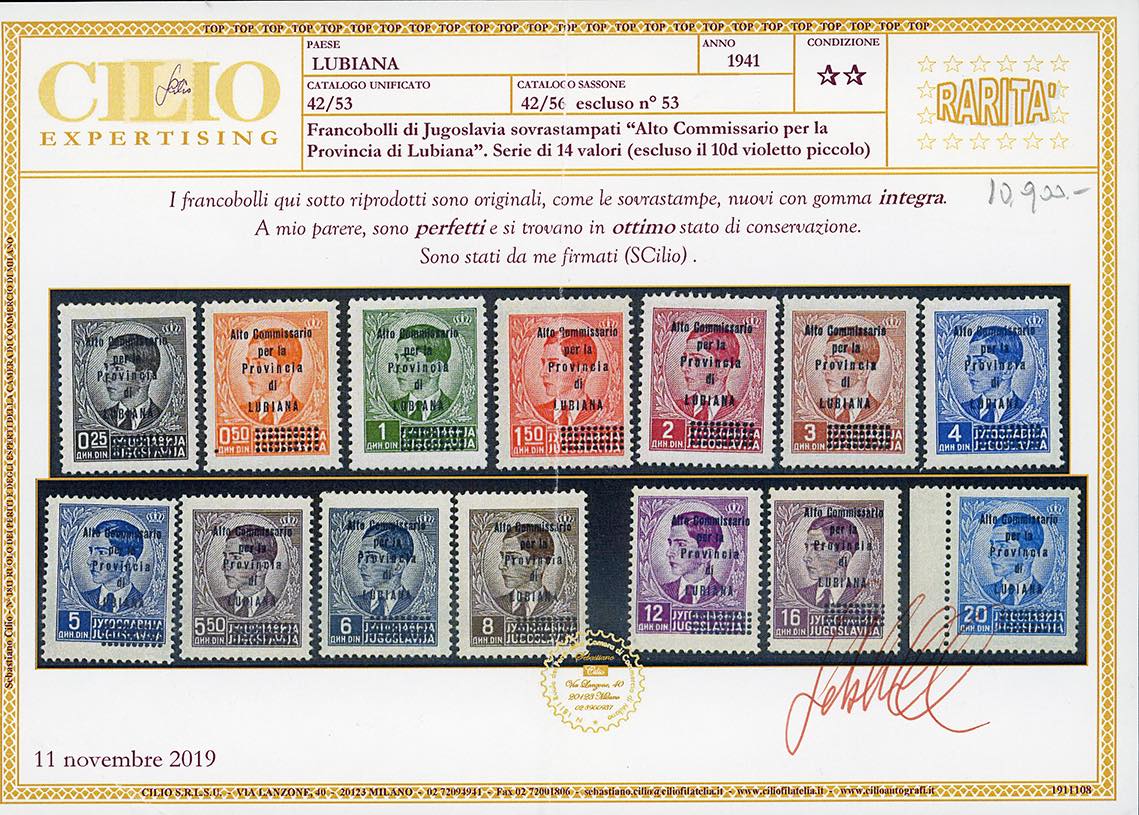 LUBIANA 1941 - Soprastampati "Alto Commissario", serie completa senza il valore da 10 din. (42/52,54/56), nuovi, gomma originale integra, perfetti. Ottima qualità, rari. Occasione. Firmati Sassone, cert. Cilio.