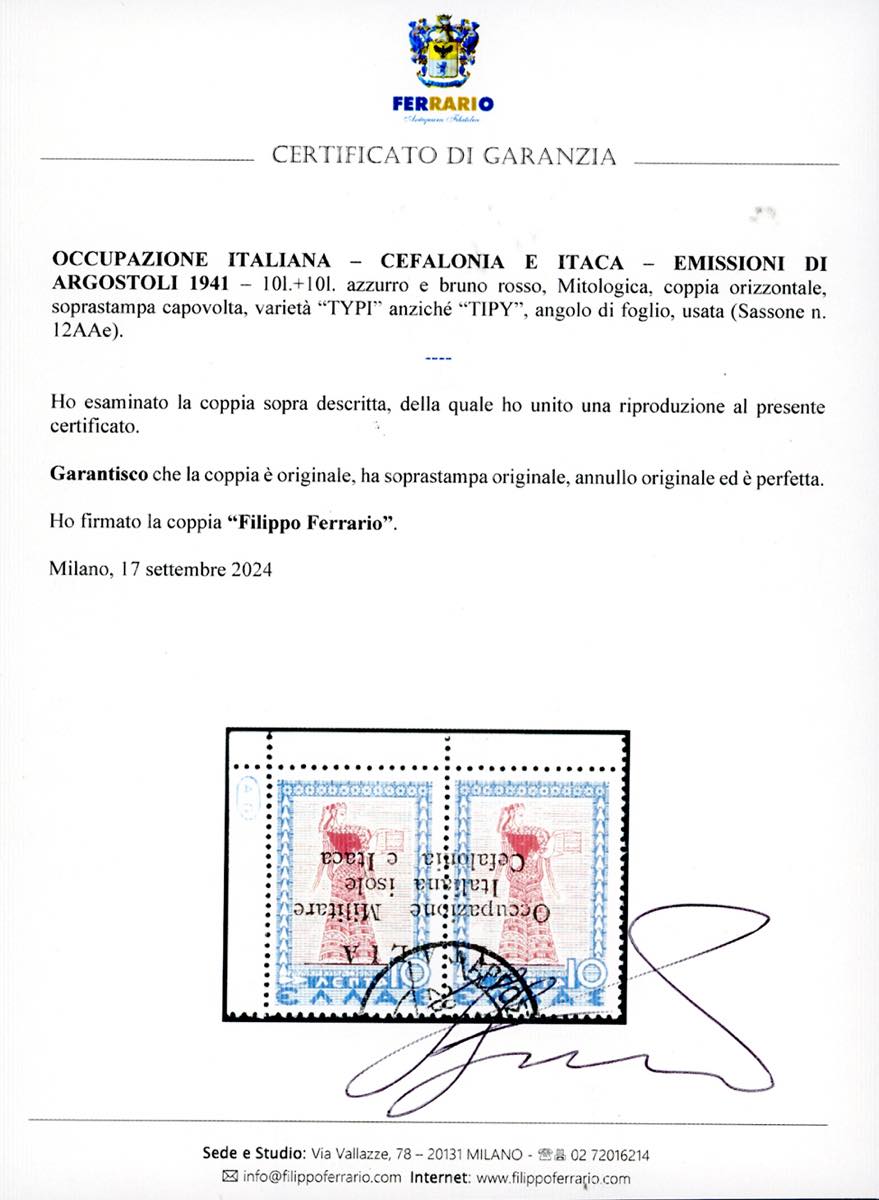 CEFALONIA E ITACA - EMISSIONI DI ARGOSTOLI 1941 - 10 l. + 10 l. mitologica, varietà "TYPI" anziché "TIPY", soprastampa a macchina capovolta (12AAe), angolo di foglio, usato, perfetto. Si tratta dell'UNICO ESEMPLARE NOTO, citato dal catalogo Sassone. Rarità del settore. Avanzo, cert. Ferrario.