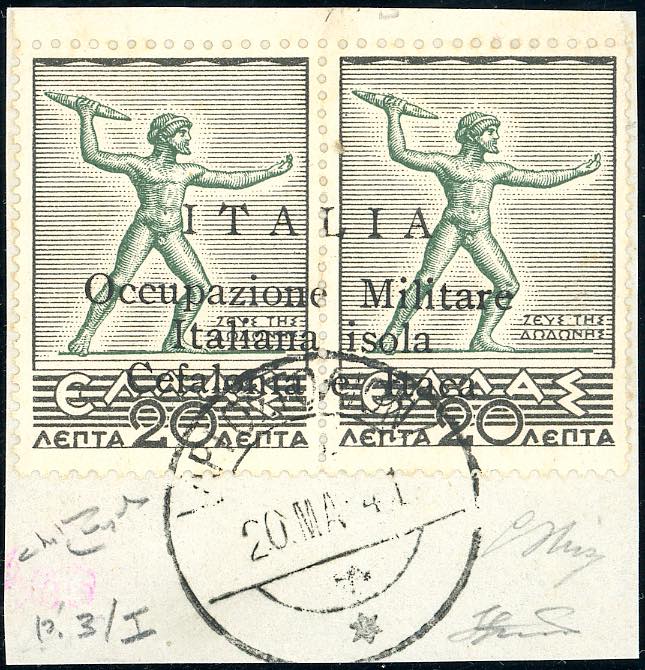 CEFALONIA E ITACA - EMISSIONI DI ARGOSTOLI 1941 - 20 l. + 20 l. Mitologica, varietà "ISOLA" al posto di "ISOLE" (13r), perfetto, usato su frammento. Rarissimo. Raubaudi, G.Oliva, Ferrario.