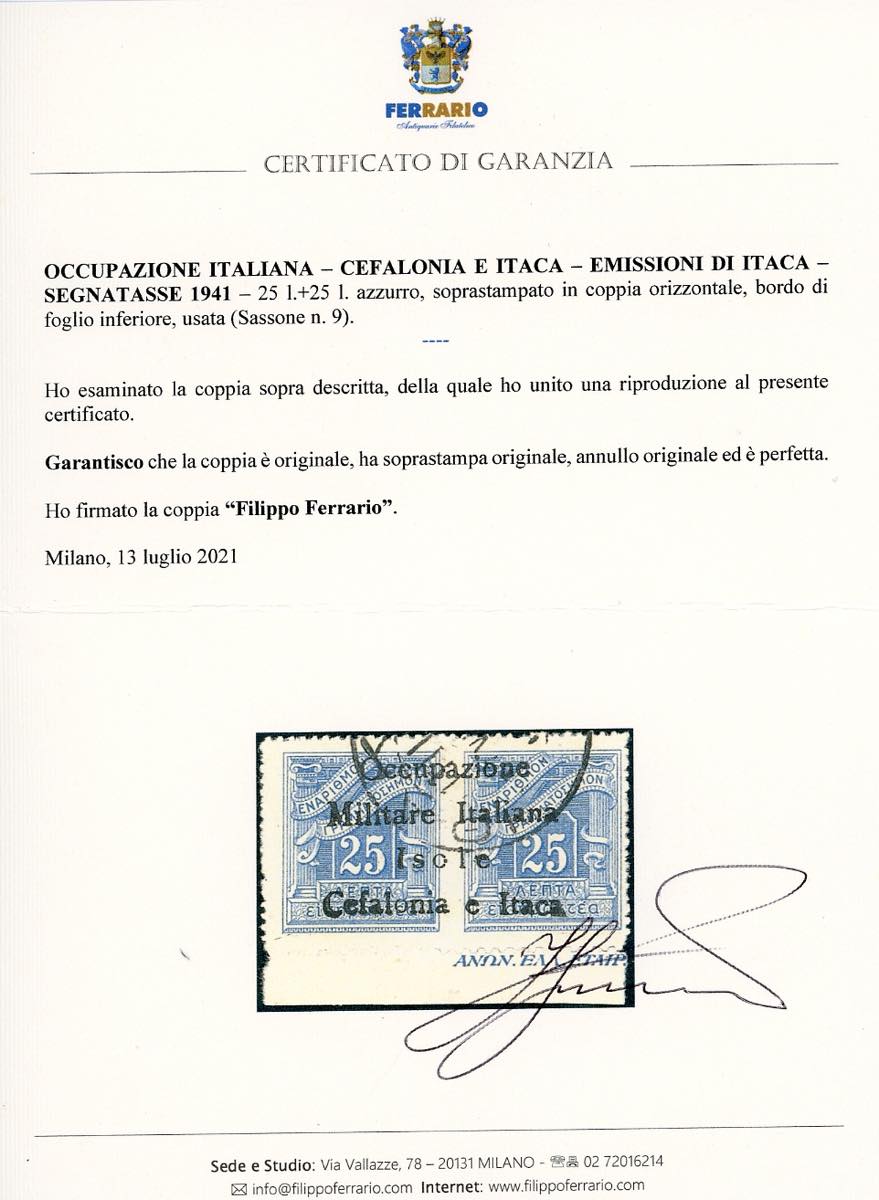 CEFALONIA E ITACA - EMISSIONI DI ITACA SEGNATASSE 1941 - 25 l. + 25 l. soprastampato (9), bordo di foglio, usato, perfetto. Raro. Penco, A.Diena, cert. E.Diena e Ferrario.
