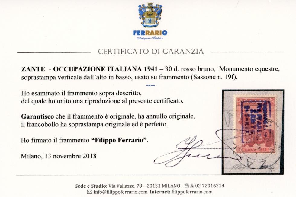 ZANTE 1941 - 30 d. Monumento equestre, soprastampa verticale dall'alto in basso (19f), usato su piccolo frammento. G.Oliva. Cert. Ferrario.