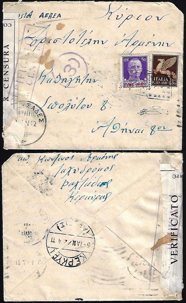ISOLE JONIE 1942 - 50 cent. Imperiale e Pegaso di Posta aerea (8,A1), perfetti, su busta censurata da Kerkyra 6/1/1942 ad Atene, con francobolli annullati con il bollo numerale muto di censura. Insieme molto raro! Ferrario.