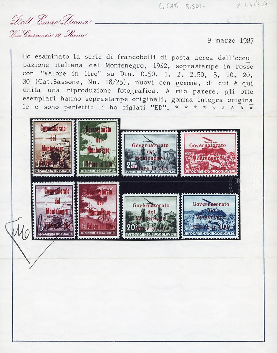 MONTENEGRO POSTA AEREA 1942 - Soprastampati in rosso, serie completa (18/25), gomma originale integra, perfetti, ad eccezione del 5 d. che presenta un piccolo difetto. Rara, tiratura 500 serie. Cert. E.Diena.