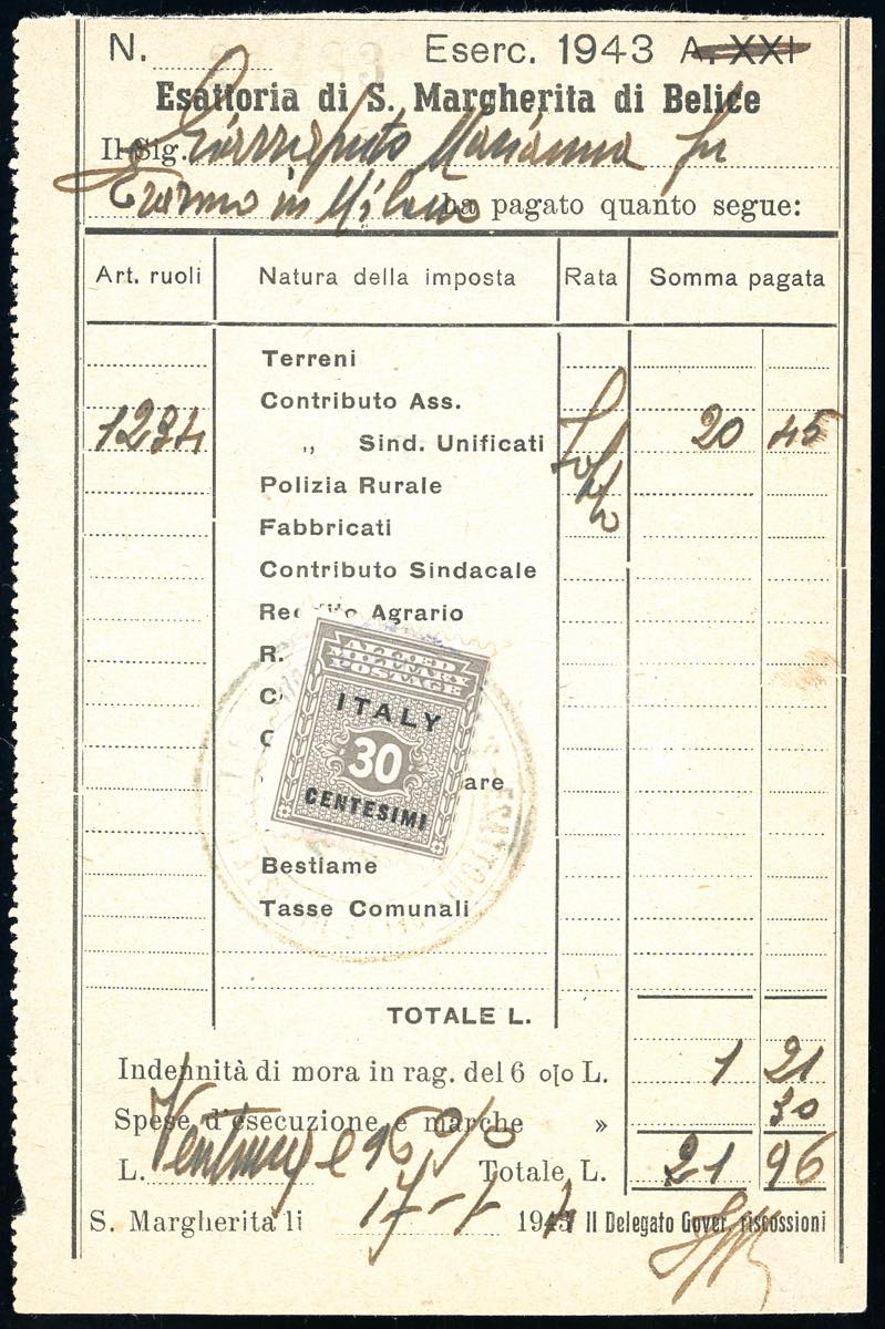 AMGOT OCCUPAZIONE ANGLO-AMERICANA SICILIA 1944 - 30 cent. (3), perfetto, in uso fiscale su quietanza di pagamento datata S.Margherita di ... Leggi tutto
