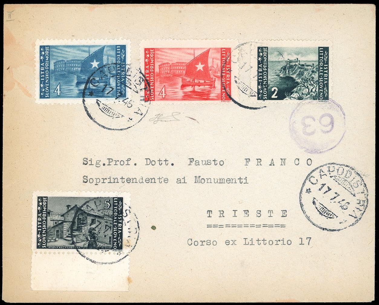 OCCUPAZIONE JUGOSLAVA ISTRIA E LITORALE SLOVENO 1946 - 4 lire, azzurro scuro, tiratura di Lubiana, 4 lire rosso, 2 lire e 5 lire, tiratura di Zagabria (46,55,56,57), perfetti, su busta da Capodistria 17/7/1946 a Trieste, bollo d'arrivo. Rara affrancatura comprendente valori gemelli.