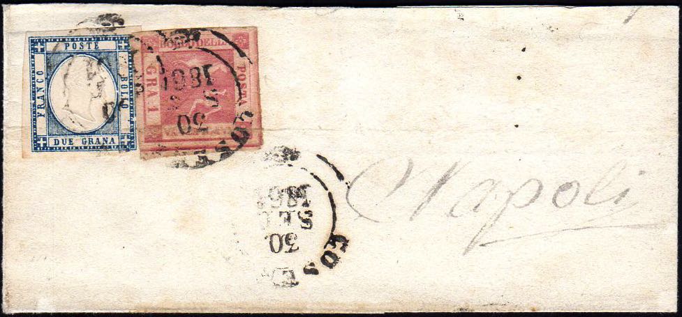 1861 - 1 grano rosa carminio, II tavola, in affrancatura mista con 2 grana azzurro (4,20b), ben marginato, su ampio frammento di lettera da Cosenza 30/9/1861 a Napoli, lieve piega orizzontale.